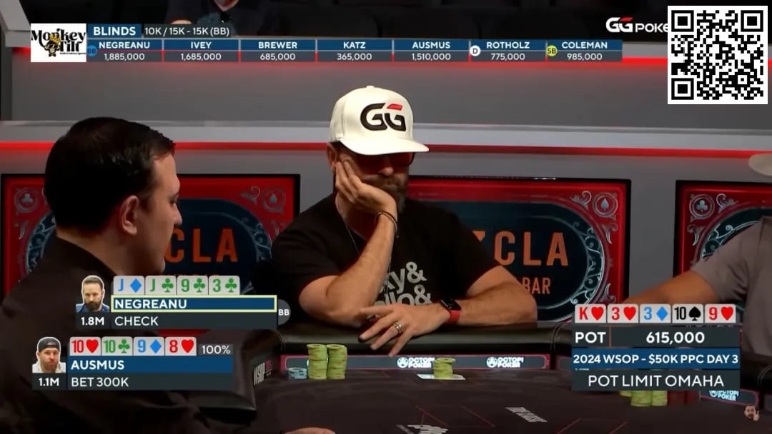 Coleman和Daniel还是过牌,底池315k,Ausmus下注300k,几乎满池,Coleman秒速弃掉自己的一对。